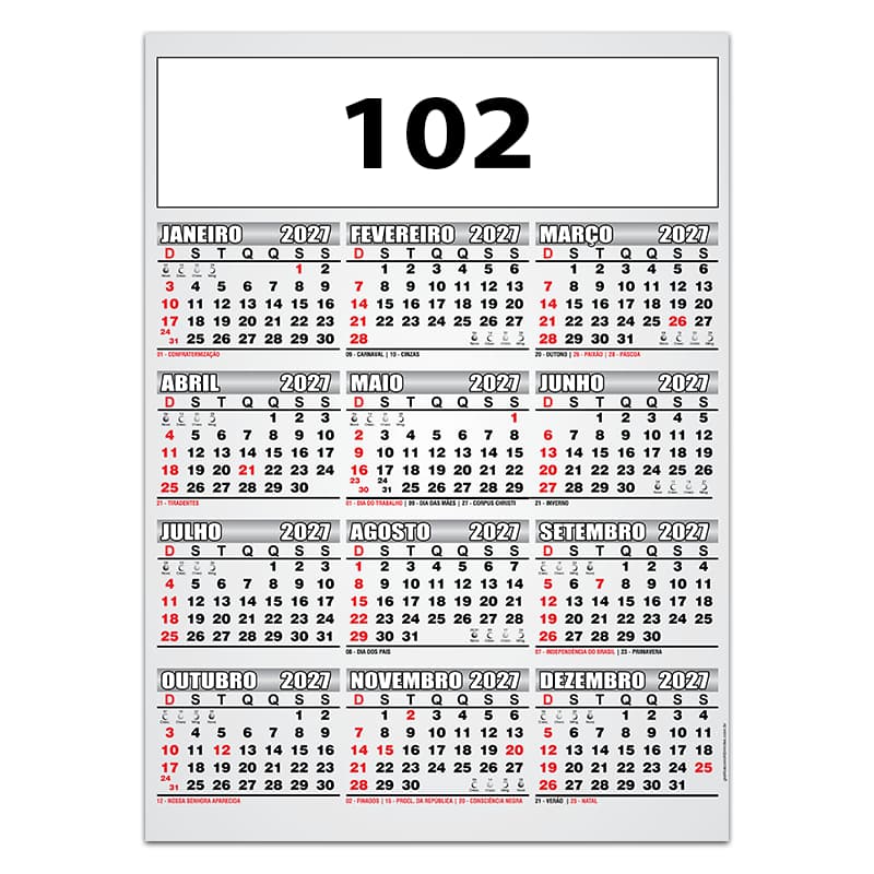 Home > Calendários > Calendários de Parede > Série 100 Condri Série 100 Condri Referência: 100C Descrição: Formato: 27 x 37,5 cm Papel: Cartão Duplex Espaço propaganda: 25 x 6 cm Acabamento: Verniz UV Total com Furo Quantidade mínima: 200 unidades Voltar para Calendários de Parede Faça um orçamento!